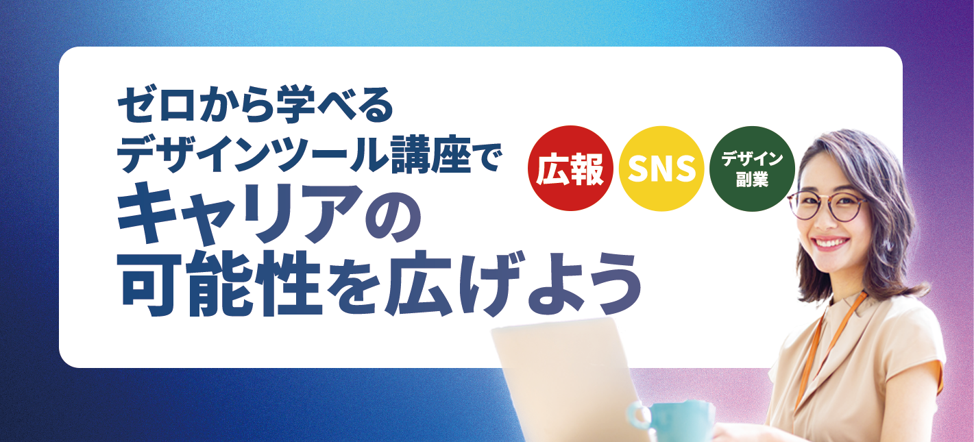 今、圧倒的にニーズの高い「デザインができる人材」。 お仕事でも転職でも、副業でも選択肢が広がります。 まずはデザインツールの使い方を学ぶことが、 あなたのキャリアを切りひらく第一歩! 基礎からしっかり学べるから、未経験でも安心です。